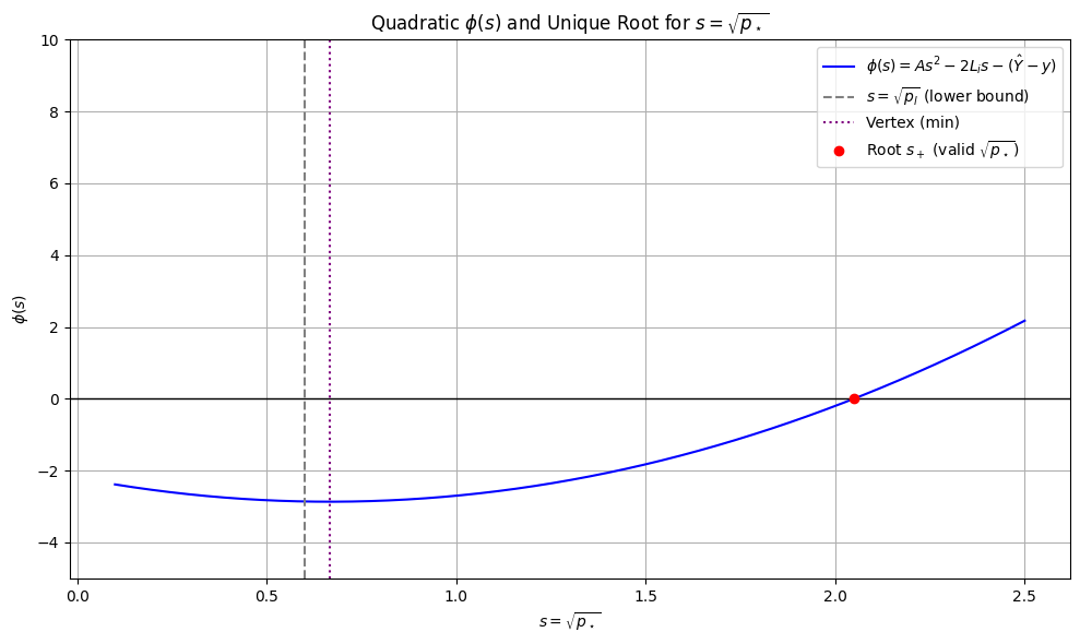 Let's take the above quadratic as a function ϕ ( s ) \phi(s) ϕ ( s ) s.t. ϕ ( p ⋆ ) = 0 \phi(\sqrt{p_\star}) = 0 ϕ ( p ⋆ ) = 0 :